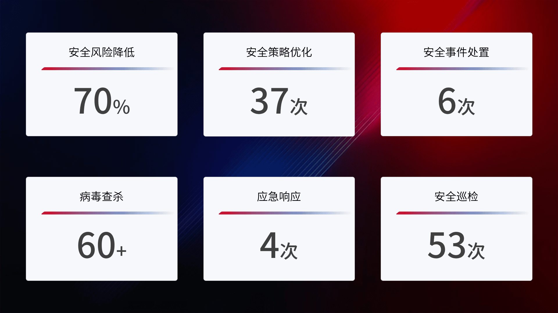 提供全面的安全事件报告体系,,,,包括处置报告、、、周报、、、、季度和年度总结,,,,结合持续监控,,帮助客户深入了解网络安全状况。。。。